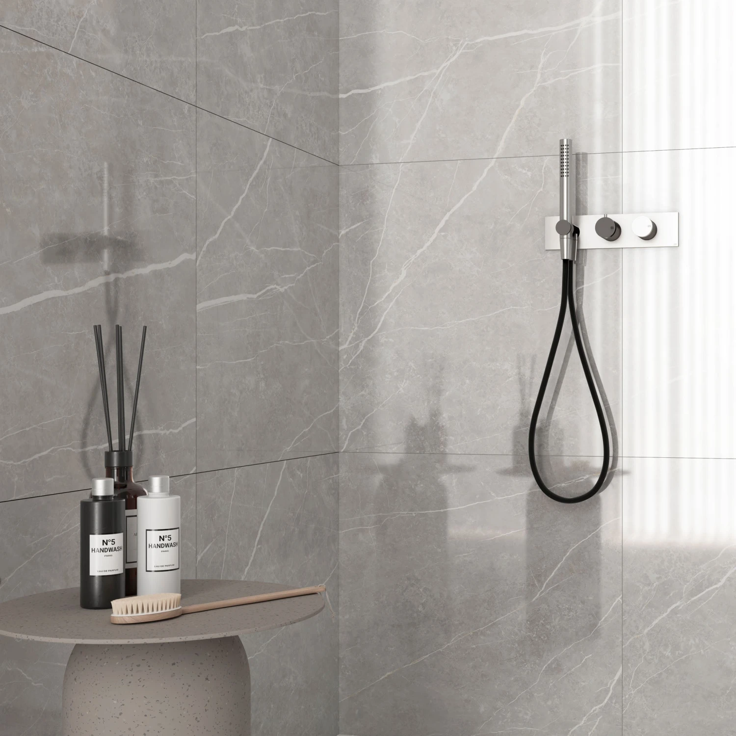 Made from highly-polished porcelain, they team a medium grey shade with a marble effect style. The overall look is perfect for homes that blur the lines between contemporary and luxe, and the distinctive white veins will complete the look.