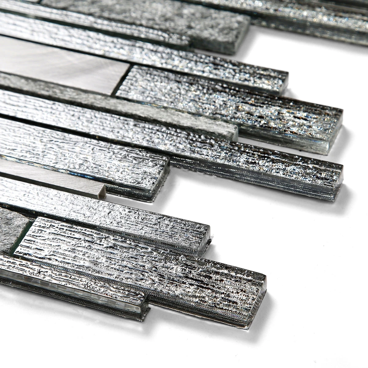 Seemingly laid at random, the linear strips will infuse your space with a sharp, contemporary touch. For added detail thereās a variety of finishes which keep these mosaics on the right side of flashy; flamed stone and brushed metal tone down the glitz of the etched glass.