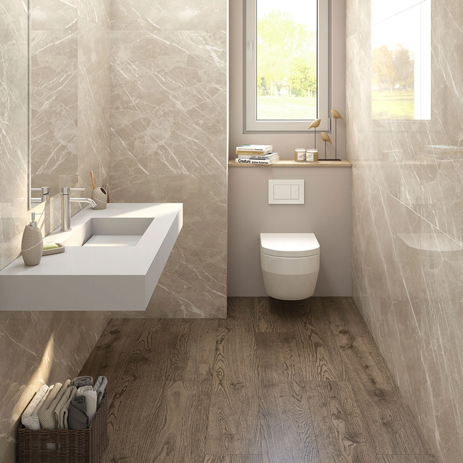 To elevate your room far beyond the ordinary, the surface of the tiles is polished to a mirror-like finish. This makes the tiles a perfect choice for creating a hotel-style bathroom, especially if your room is on the smaller side.