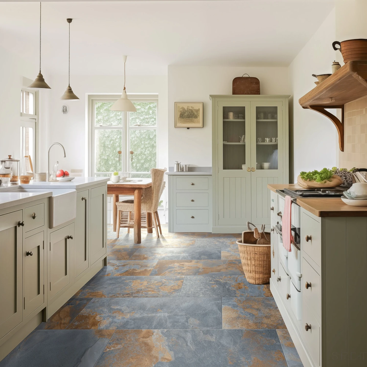 Looking to create an eye-catching floor or wall? These expressive slate effect tiles tick all the right boxes. With blue-grey tones and authentic rusty swirls, they’re full of drama and offer a rustic alternative to polished marbles or sleek concretes. In a kitchen, their rugged beauty will help you create a striking floor that contrasts against Shaker units or glossy cabinets; alternatively, why not style a bathroom with a moody, spa-like quality?
