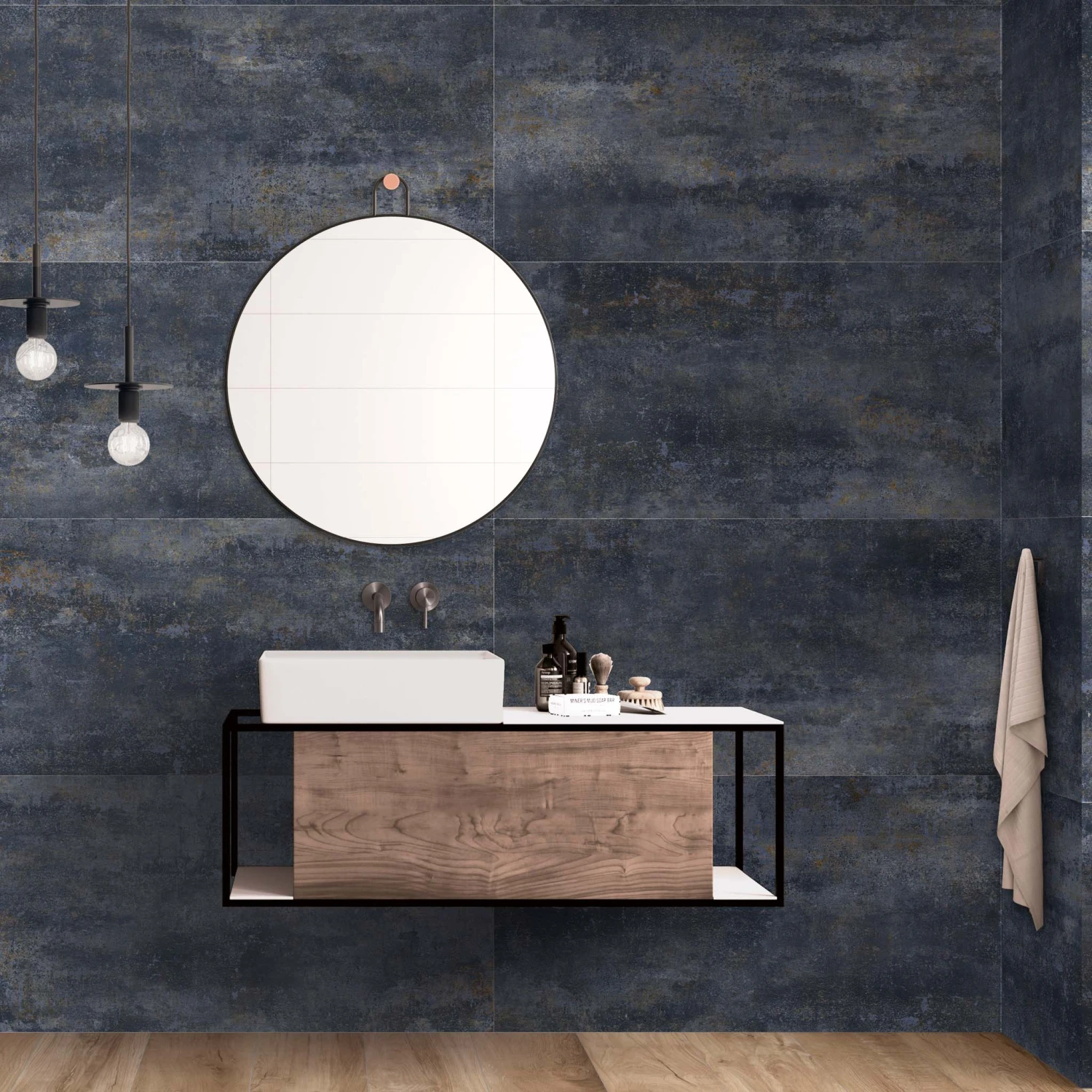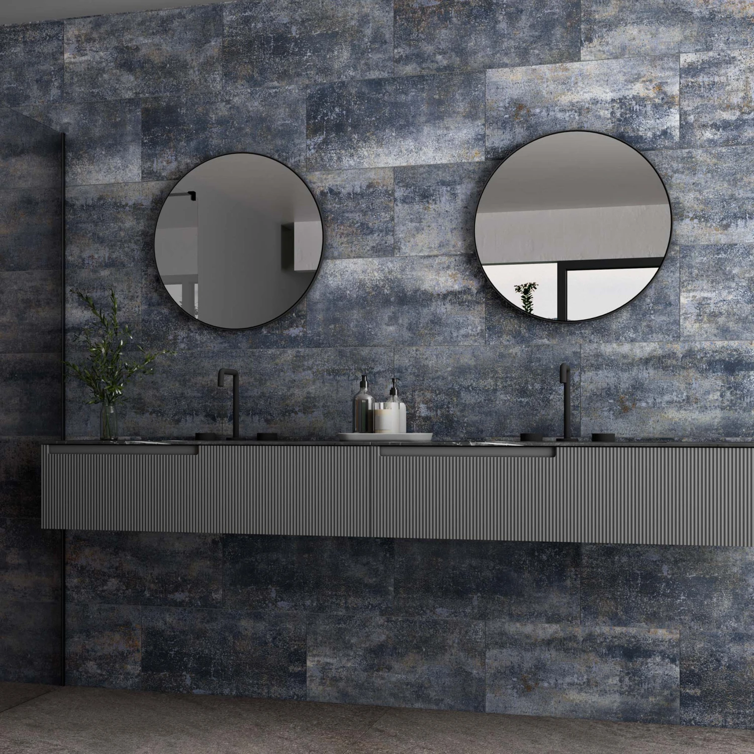 And our Highline Blue tiles do exactly that. Their moody dark hue is embellished with rust and silver tones, convincingly replicating the appearance of weathered metal.