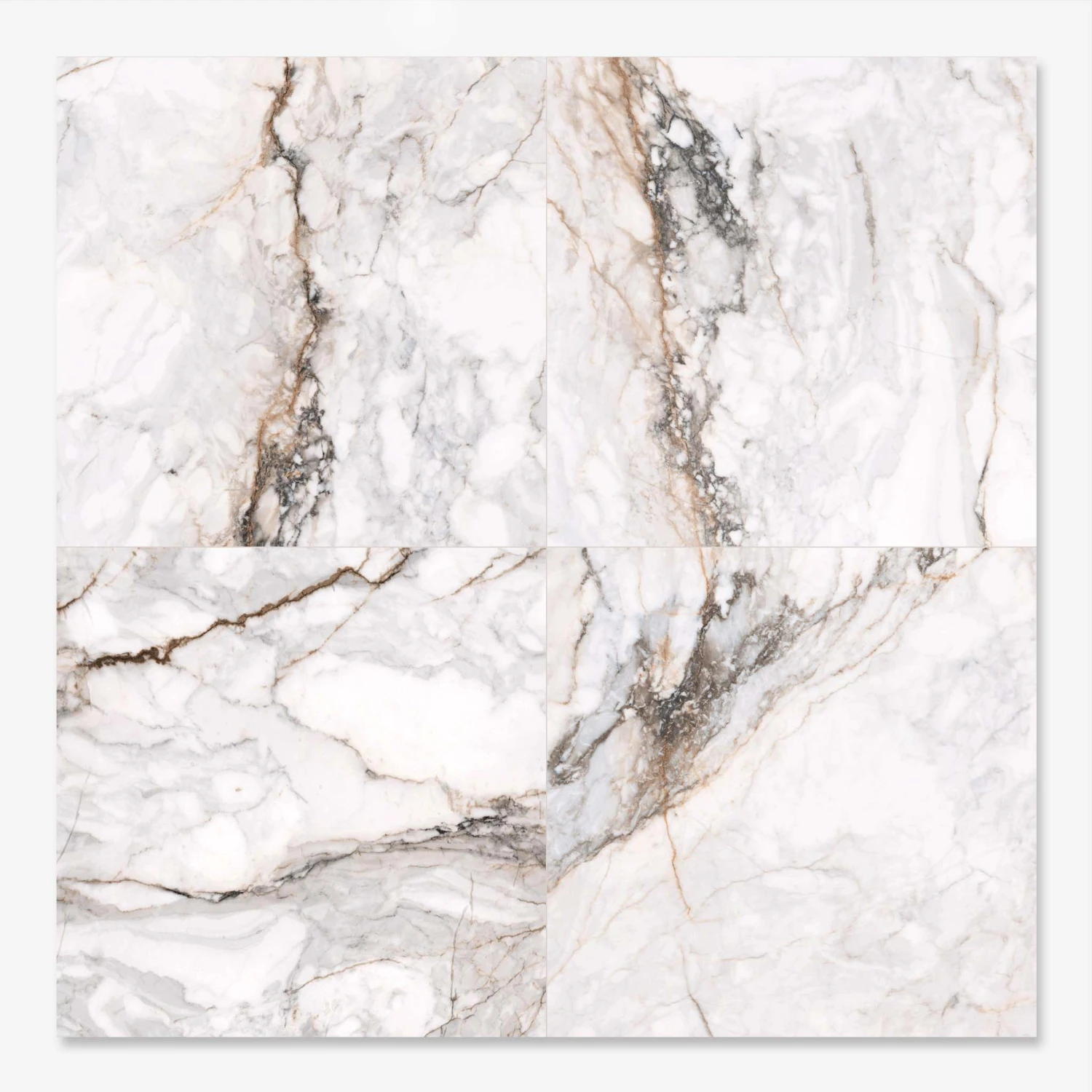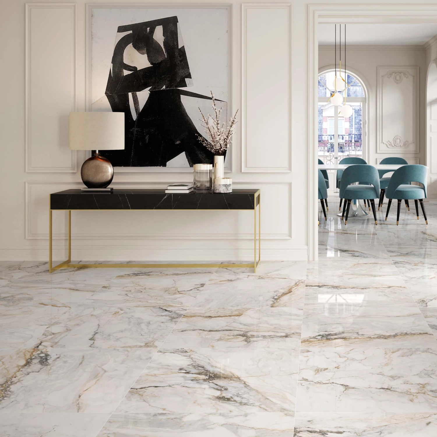 And there’s more. These tiles have an extra-opulent twist thanks to their distinctive gold veins, bringing a warmth that can be missing from traditional white marble. Their highly polished finish adds another layer of luxe, making it easy to transform a bathroom or entranceway into a sumptuous space.