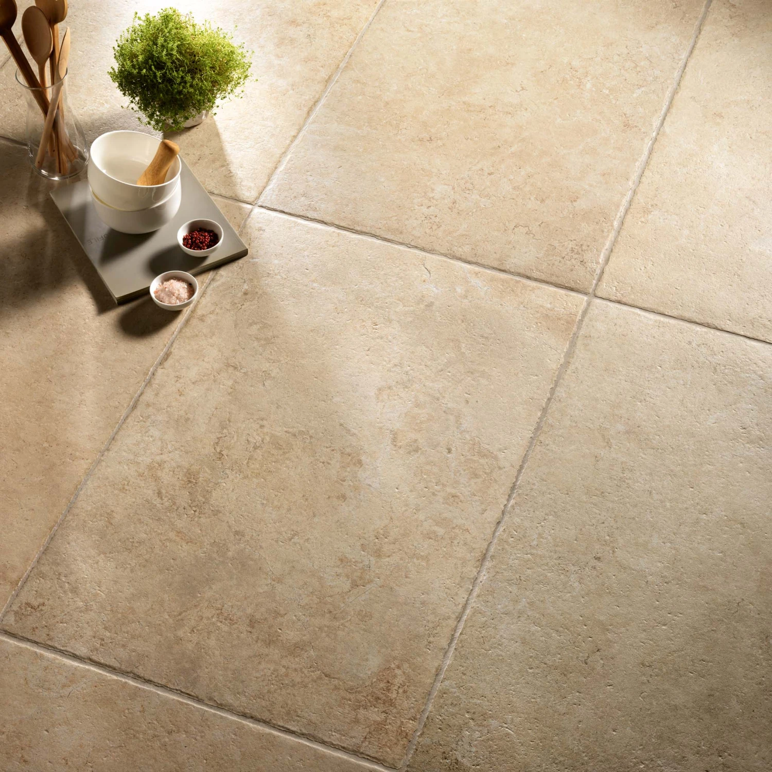Inspired by traditional French limestone, theyâre the kind of flooring youâd expect to find in a farmhouse cuisine in Provence. Think a rustic, tumbled appearance with rich beige tones; intricate veining and beautiful shading; and slightly-chipped edges that mimic the beauty of aged natural stone. And thatâs before we mention the large format size – at 60 x 90 cm, itâs the perfect format for both large and smaller rooms alike.