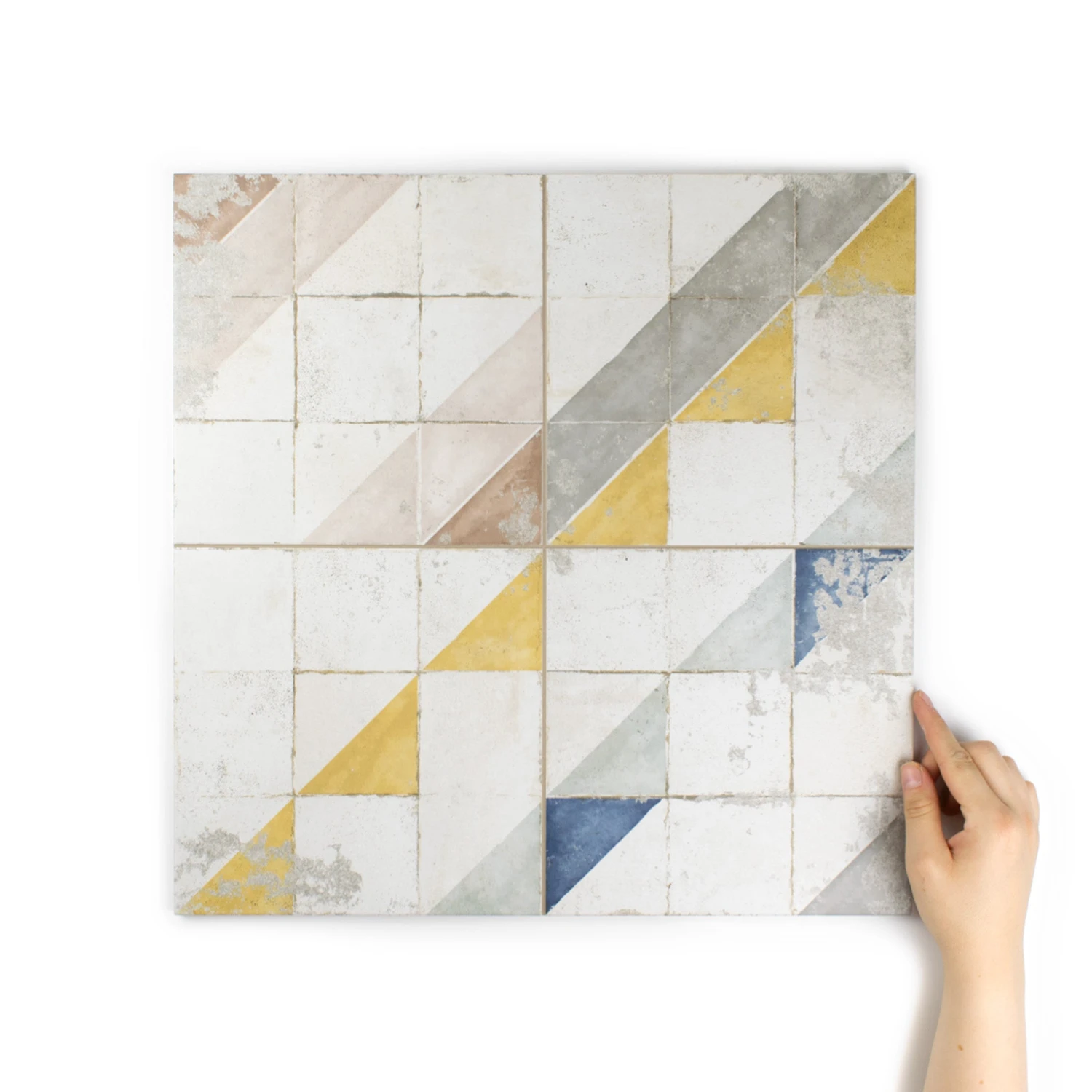 Each Metropolitan Mix tile measures approximately 45 x 45 cm and is split into 4 ‘separate’ pieces by a scored grout gap – we’ll send out one of these pieces as a sample. There are 10 different tiles in total.