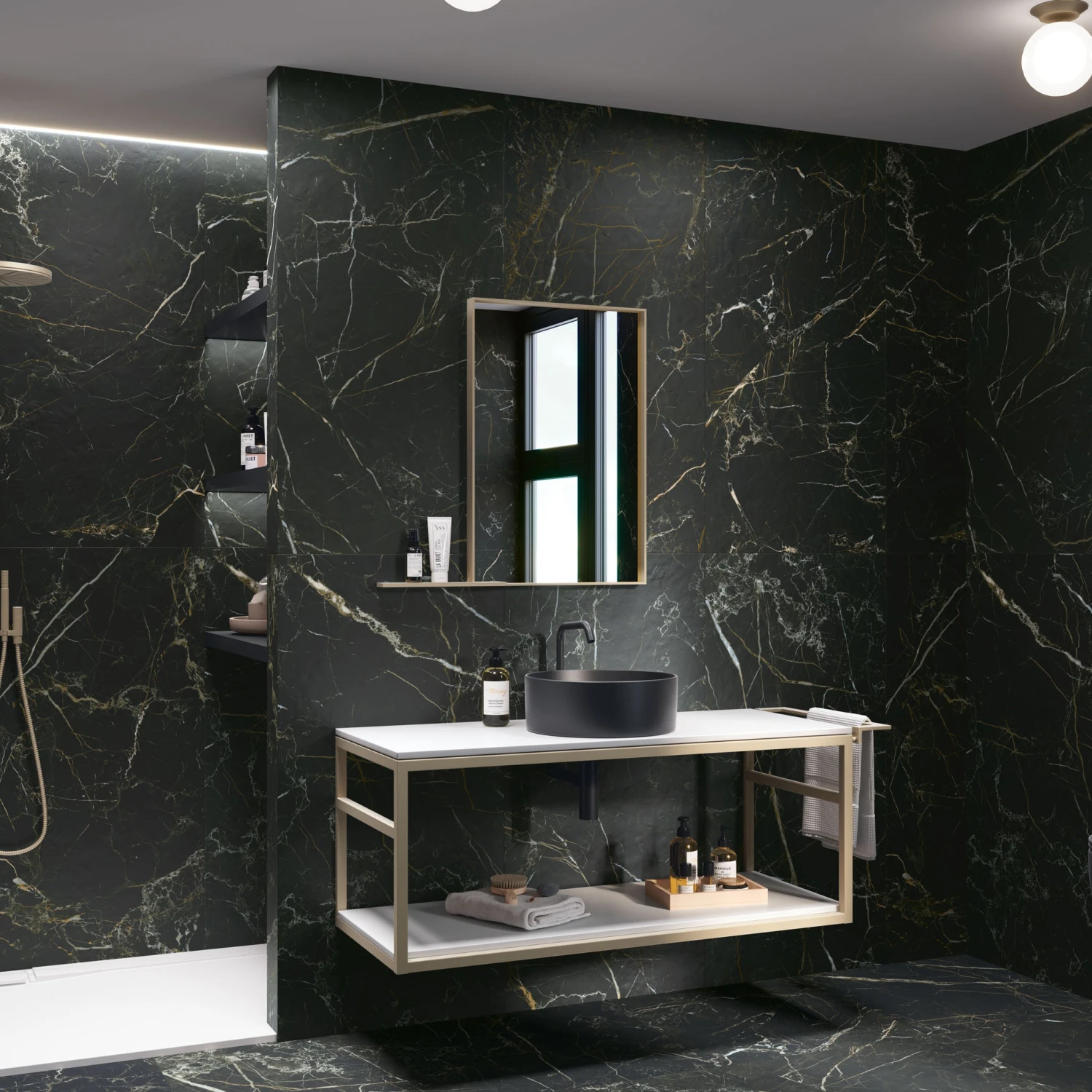 Feel like white marble is a little overused? Then you’ll love these dark and decadent porcelain tiles. With their intense black colour, they’re designed to create a striking atmosphere in any interior.