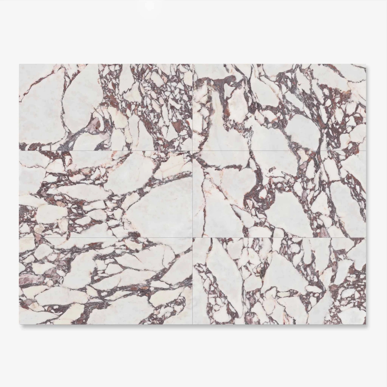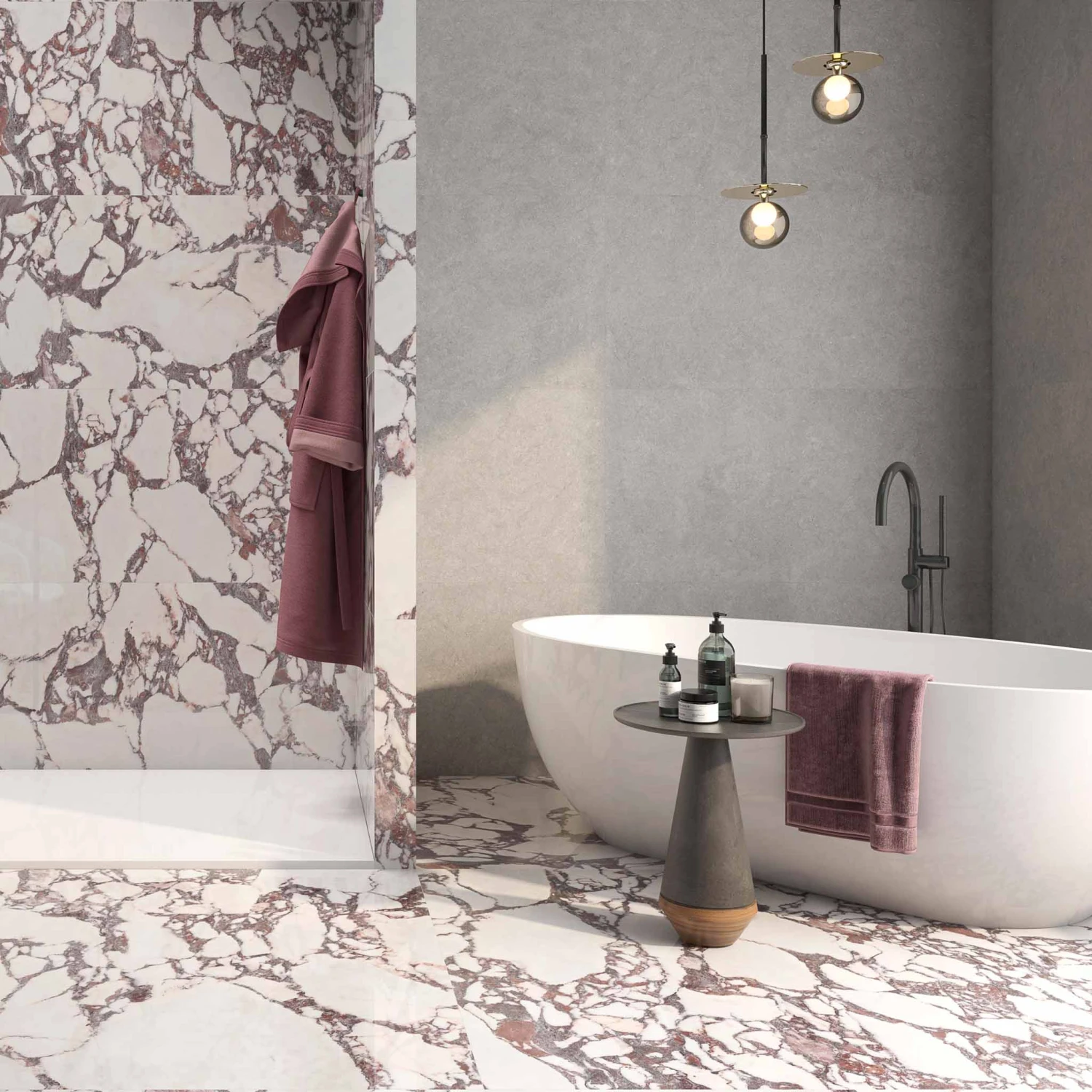This striking take on Calacatta marble is guaranteed to make an impressive statement. The burgundy tones of the veins cut a vivid dash against the white background, making these tiles an unusual and distinctive addition to any home. Perfect for a feature wall or statement bathroom.